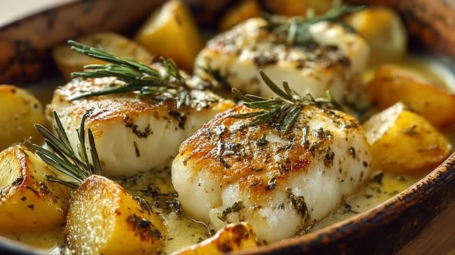A comforting dish featuring tender cod and creamy potatoes infused with the aromatic essence of rosemary.