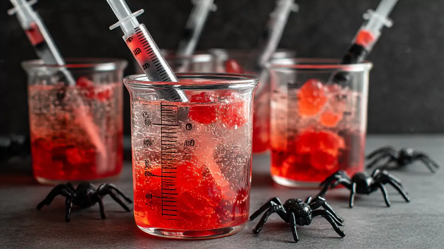 The classic Shirley Temple mocktail gets a spooky twist for Halloween! Served in beakers with grenadine-filled syringes, these Creepy Shirley Temples are fizzy, festive, and perfect for kids or alcohol-free party options.