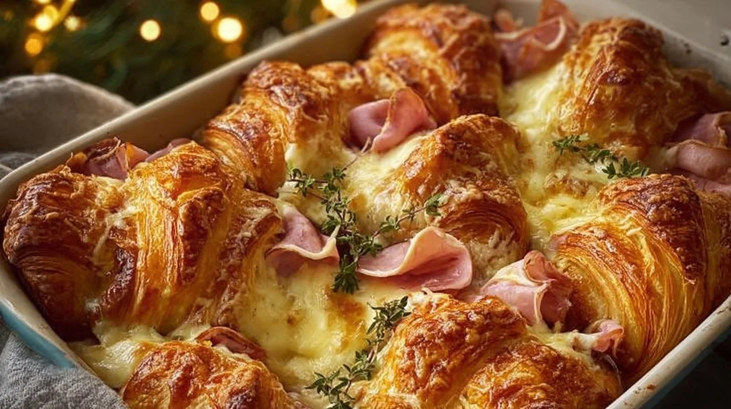 An elegant breakfast casserole made with flaky croissants, savory custard, ham rosettes, and Gruyère cheese, finished with aromatic garlic-herb butter.