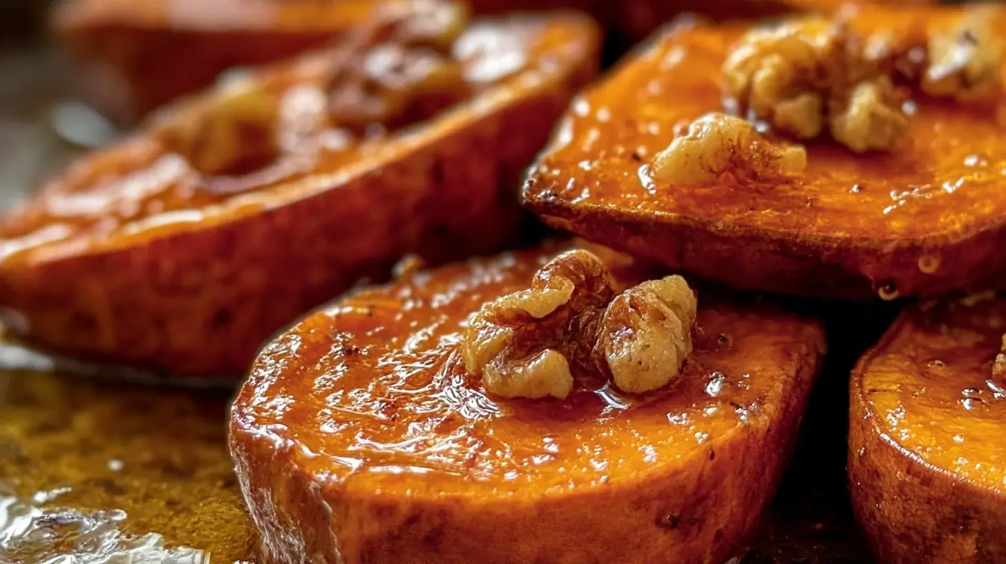 Crispy, caramelized roasted sweet potatoes topped with a delicious maple-walnut glaze, perfect for holiday gatherings.