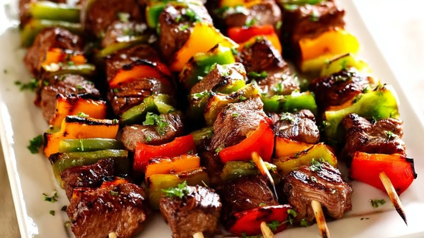 Juicy grilled steak kebabs infused with smoky flavors and vibrant vegetables, perfect for barbecues and gatherings.