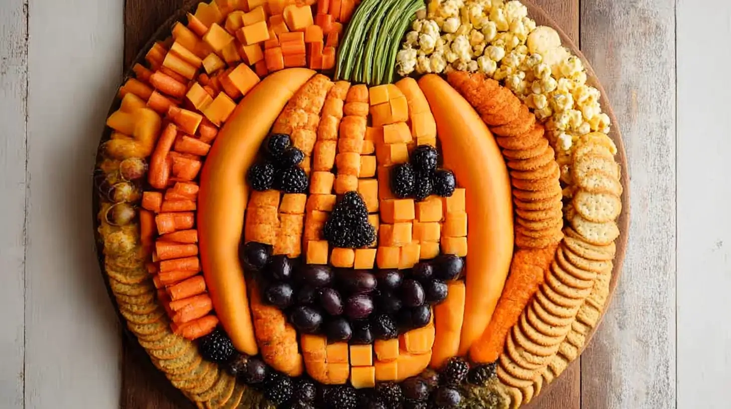 Wow your guests with this festive pumpkin charcuterie board featuring a variety of easy appetizers, perfect for Halloween parties.