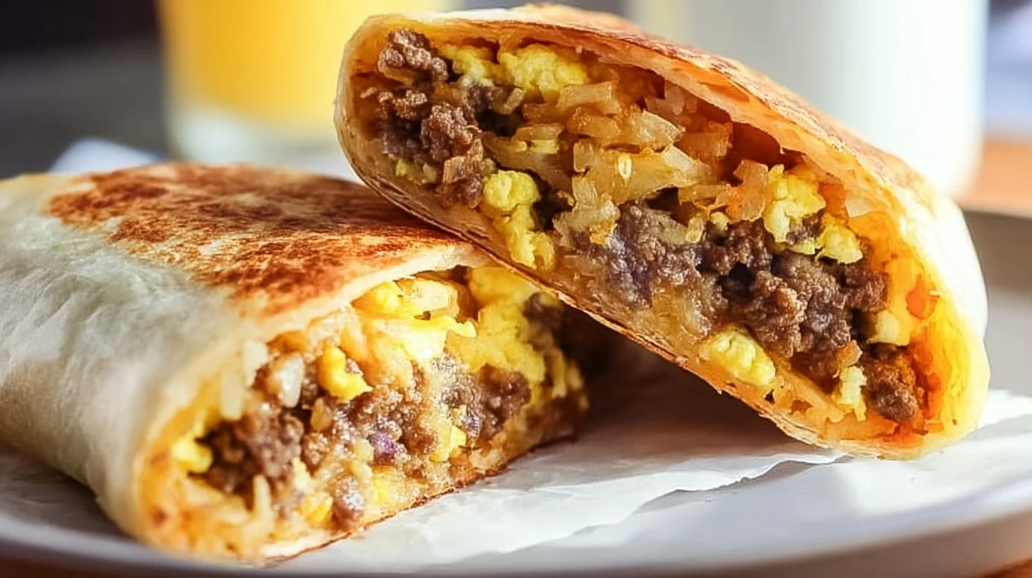 - Assemble: tortilla + sauce + eggs + sausage + hash brown + cheese.