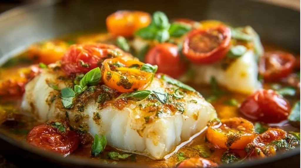 Sautéed Cod with Tomato Basil White Wine Sauce